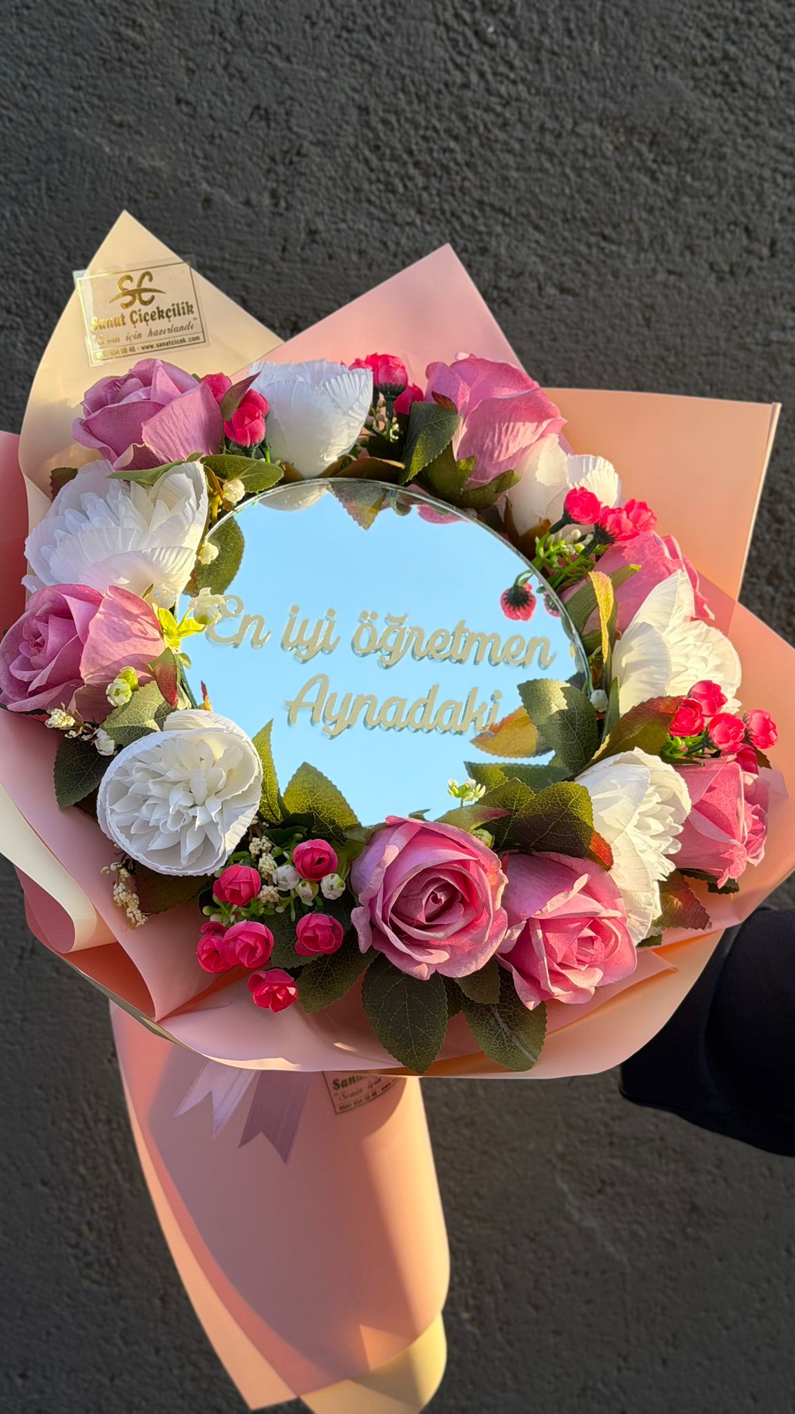 Osmanlı’da sevdiğine ayna hediye etmek ‘Senden güzeli yok’ demektir. Ömürlük kasımpatılarla çevrili bu aynalı buket, sevdiğin kişiye değerini en zarif hâliyle anlatır.